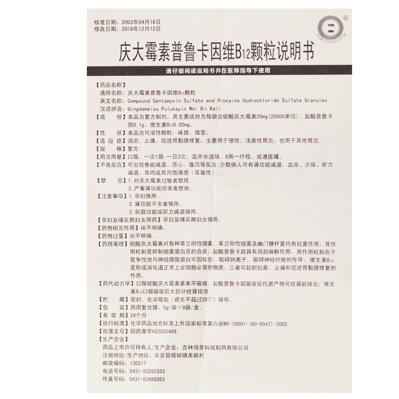 庆大霉素普鲁卡因维B12颗粒/5g*9袋