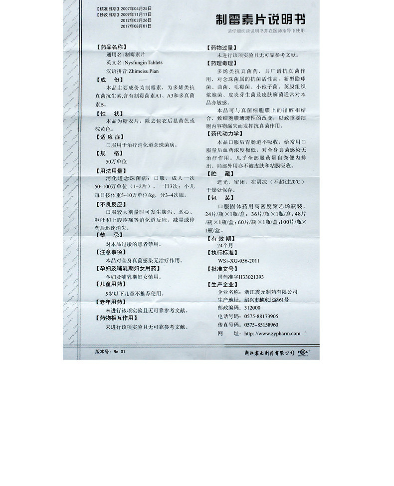 【用法用量】 消化道念珠菌病:口服,成人一次50~100万单位(1~2片),一日3次;小儿每日按体重5~10万单位/kg,分3~4次服。