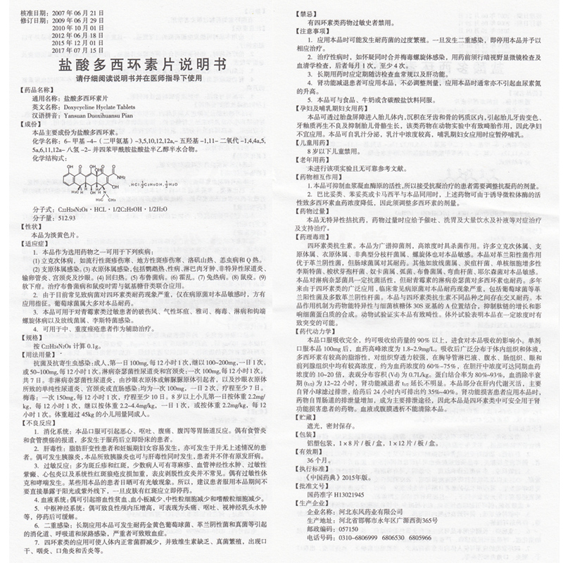 【主要成份】 本品主要成分为盐酸多西环素,其化学名为6-甲基-4-(二甲氨基)-3,5,10,12,12a,-五羟基-1,11-二氧代-1,4,4a,5,5a,6,11,12a-八氢-2-并四苯甲酰胺盐酸盐半乙醇半水合物。