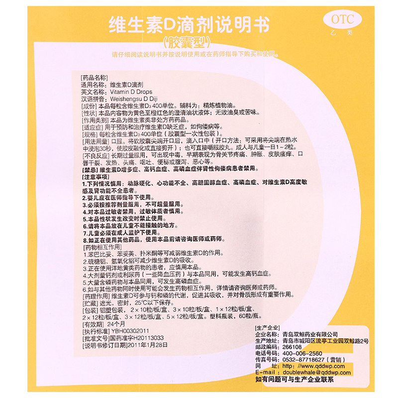 【规格】每粒含维生素D3 400单位(胶囊型一次性包装)。