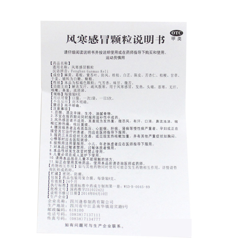 功能主治: 解表发汗,疏风散寒。用于风寒感冒,发热,头痛,恶寒,无汗,咳嗽,鼻塞,流清涕。